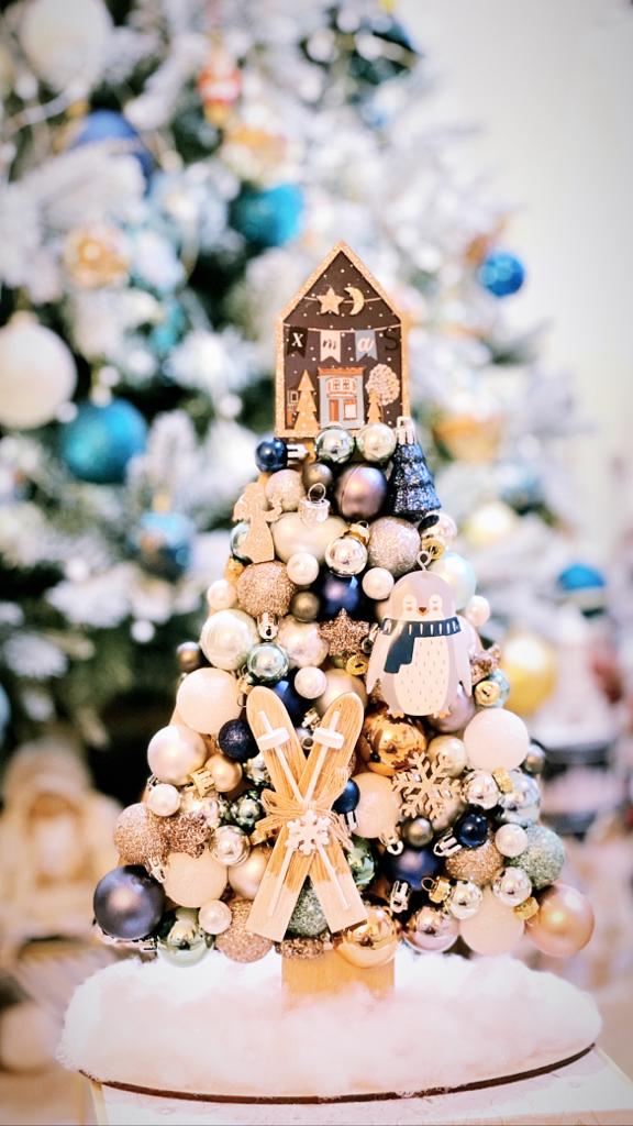 Acest brăduț decorativ unic este realizat dintr-o compoziție spectaculoasă de globuri elegante în nuanțe de alb, auriu și albastru, formând o siluetă perfectă de brad festiv. La vârf, o căsuță detaliată din lemn adaugă un plus de farmec și căldură, evocând atmosfera magică a sărbătorilor de iarnă.